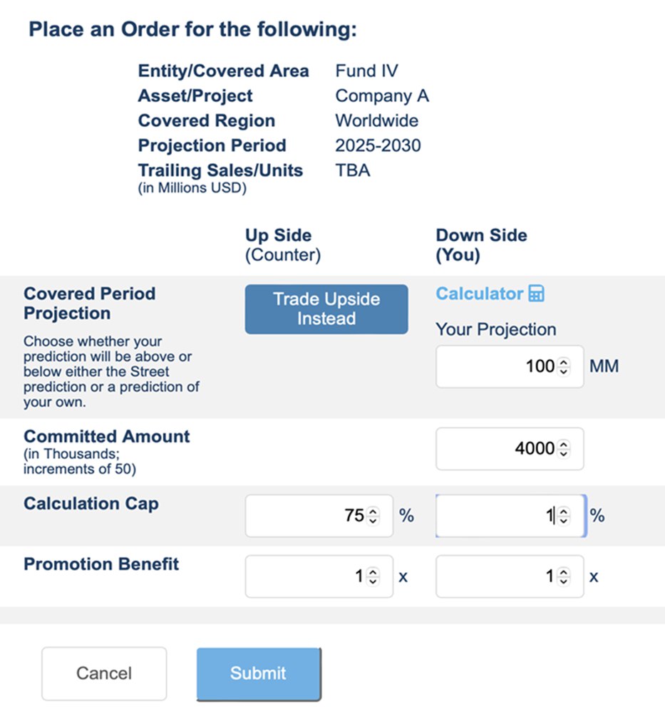 Thus, LP #10 in this hypothetical transaction is placing RFQ in Order Book to sell a 5 year right to receive first 75% appreciation (and Buyer assuming small 1% risk of loss) on 50% of its position above current $100m value of Portfolio Company A position to another LP in Fund (assuming Closed Loop) for a negotiated upfront payment to LP #10